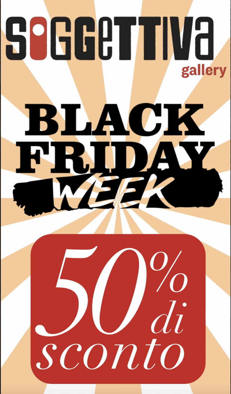 PER CELEBRARE I SUOI TRE ANNI DI ATTIVITÀ, SOGGETTIVA GALLERY TI INVITA ALLA BLACK-WEEK CON UN ECCEZIONALE SCONTO DEL 50% SU DI UNA SELEZIONE DI CIRCA 200 OPERE. SCORRI LE FOTO QUI SOTTO PER SCOPRIRLE E VIENI IN GALLERIA OPPURE USA IL COUPON BLACK50″ NELLO NOSTRO SHOP ON-LINE